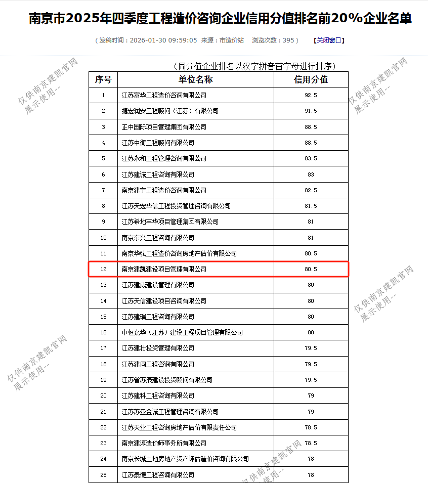 恭喜我司入選“南京市2025年四季度工程造價咨詢企業(yè)信用分值排名前20%企業(yè)名單”
