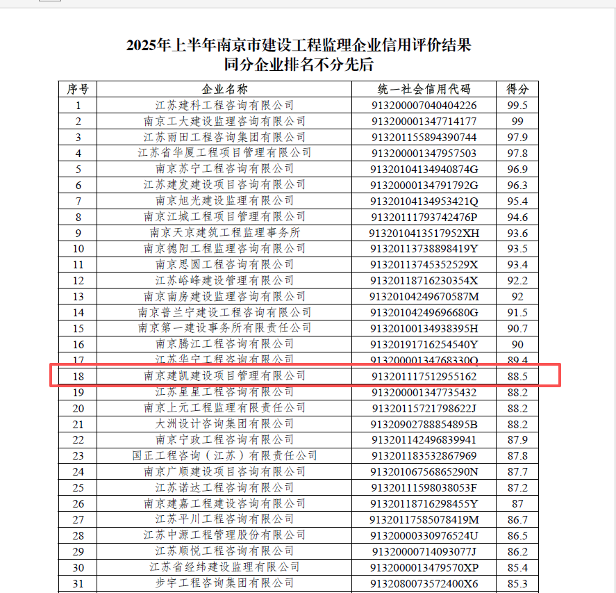 2025年上半年南京市建設(shè)工程監(jiān)理企業(yè)信用評價(jià)結(jié)果